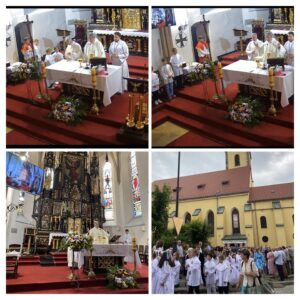 Dzisiaj, w uroczystość Najświętszego Ciała i Krwi Pańskiej, podczas Mszy Św. dzieci obchodziły rocznicę Pierwszej Komunii Świętej. Po Eucharystii poszliśmy w procesji ulicami naszego miasta manifestując wiarę w Boga ukrytego w Hostii Świętej.