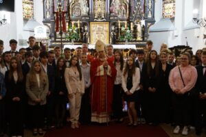 Podczas wieczornej, uroczystej Eucharystii J. E. ks. Biskup Adam Bałabuch udzielił 55 młodym osobom sakramentu bierzmowania. To wyjątkowy moment, w którym Duch Święty umacnia serca młodych ludzi do dojrzałego wyznawania wiary i świadectwa chrześcijańskiego życia. Przygotowaniem młodzieży do przyjęcia sakramentu bierzmowania zajmował się ks. Adrian Pliszka.