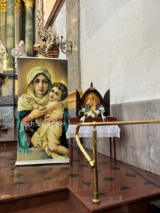 Podróż autokarem rozpoczęliśmy wspólną modlitwą i śpiewem pieśni ku czci Matki Bożej. Po przybyciu do Sanktuarium powitaliśmy Matkę Bożą, a następnie wysłuchaliśmy prelekcji Siostry Damiany, która przybliżyła nam wizję Jana Pozzobona dotyczącą Międzynarodowego Apostolatu Pielgrzymującej Matki Bożej z Szensztatu.