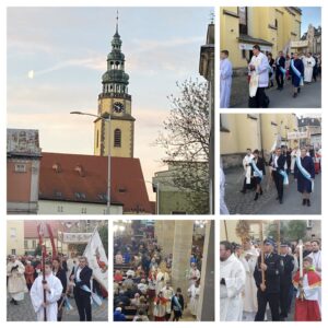 Dzisiaj celebrowaliśmy zwycięstwo życia nad śmiercią i radość Zmartwychwstania Jezusa Chrystusa. Rano odbyła się uroczysta liturgia, którą poprzedziła procesja wokół świątyni. Nasza grupa adoracyjna połączyła się z grupą z Idzikowa i pod kierunkiem pana organisty Jakuba Karmelity prowadziła oprawę muzyczną tej pięknej rezurekcji.